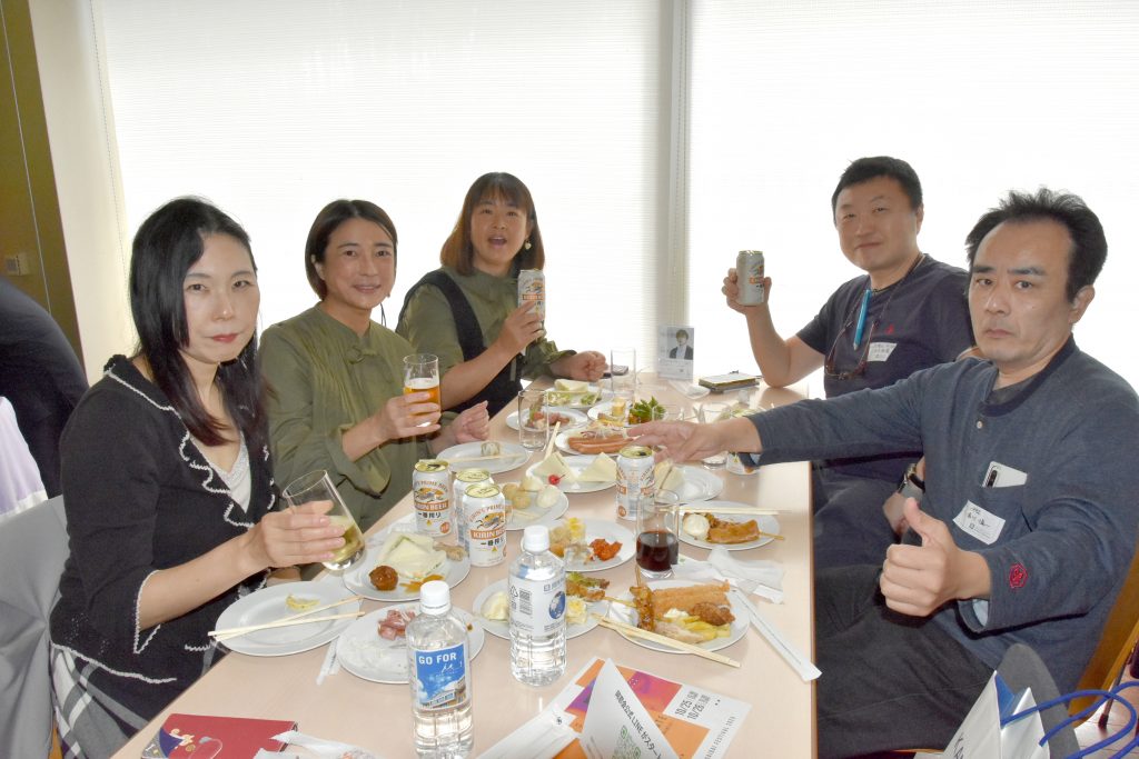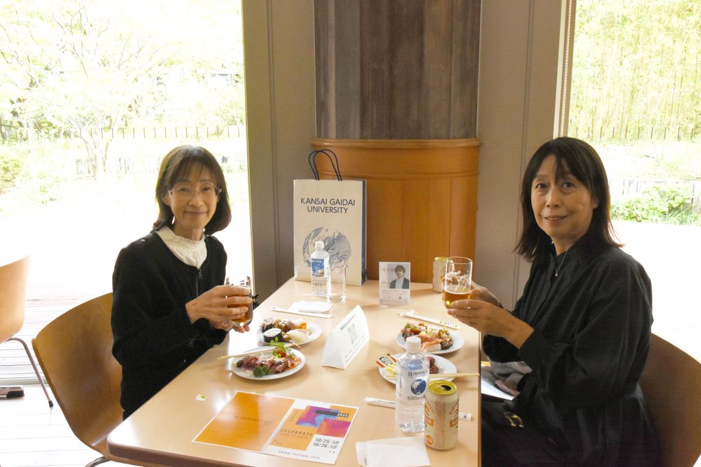 午後からは、厚生南館第3食堂で懇親会が開催されました。1983年に短期大学を卒業した林公子さんは、同期生の本屋敷恵美子さんらと毎年誘い合ってホームカミングデーに参加しており「学年は異なっても、卒業生の皆さんの頑張りや元気な姿を見るのはとても楽しみです。長女と甥も関西外大の卒業生で、大学は私だけでなく家族にとっても誇りです」と話していました。