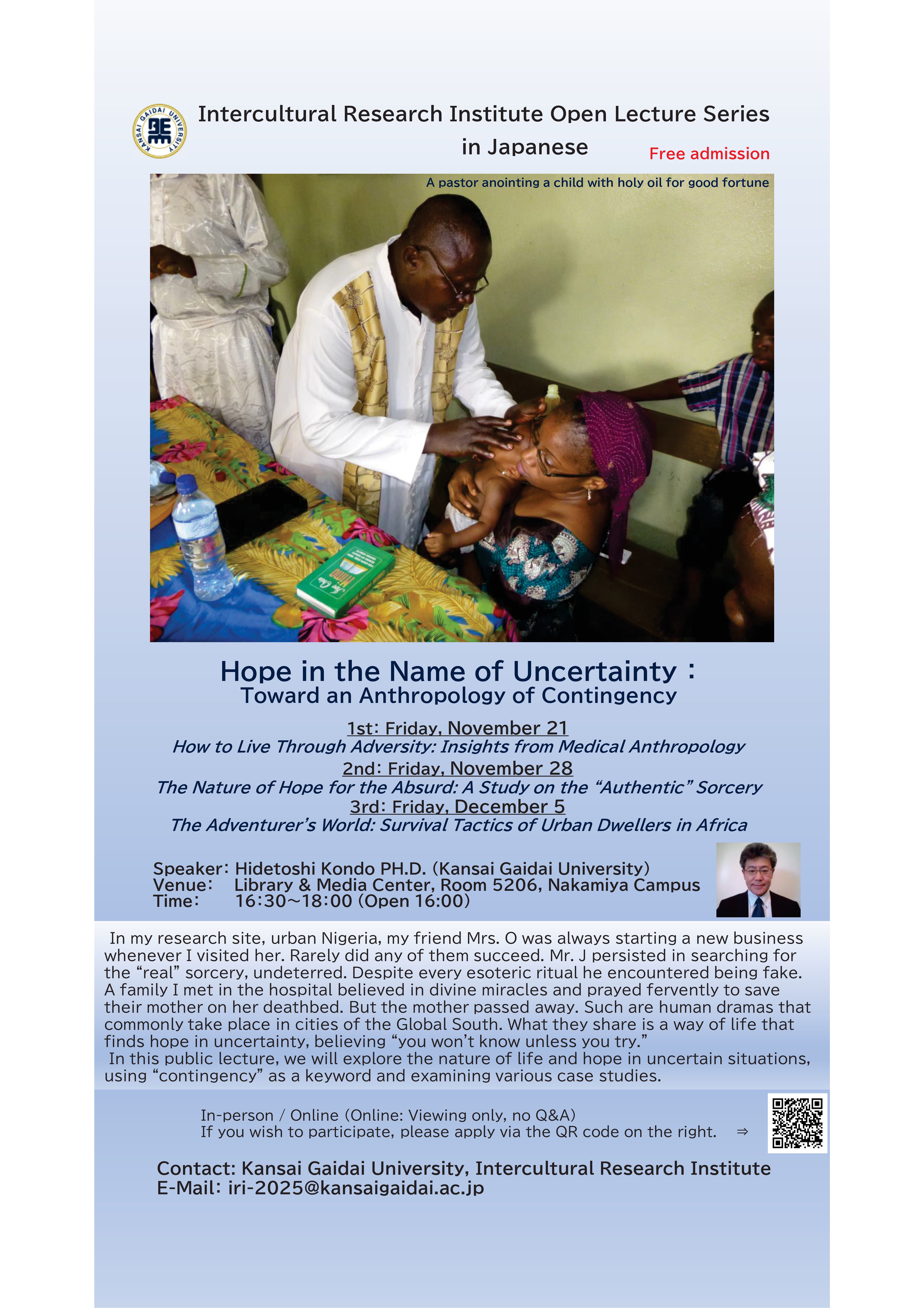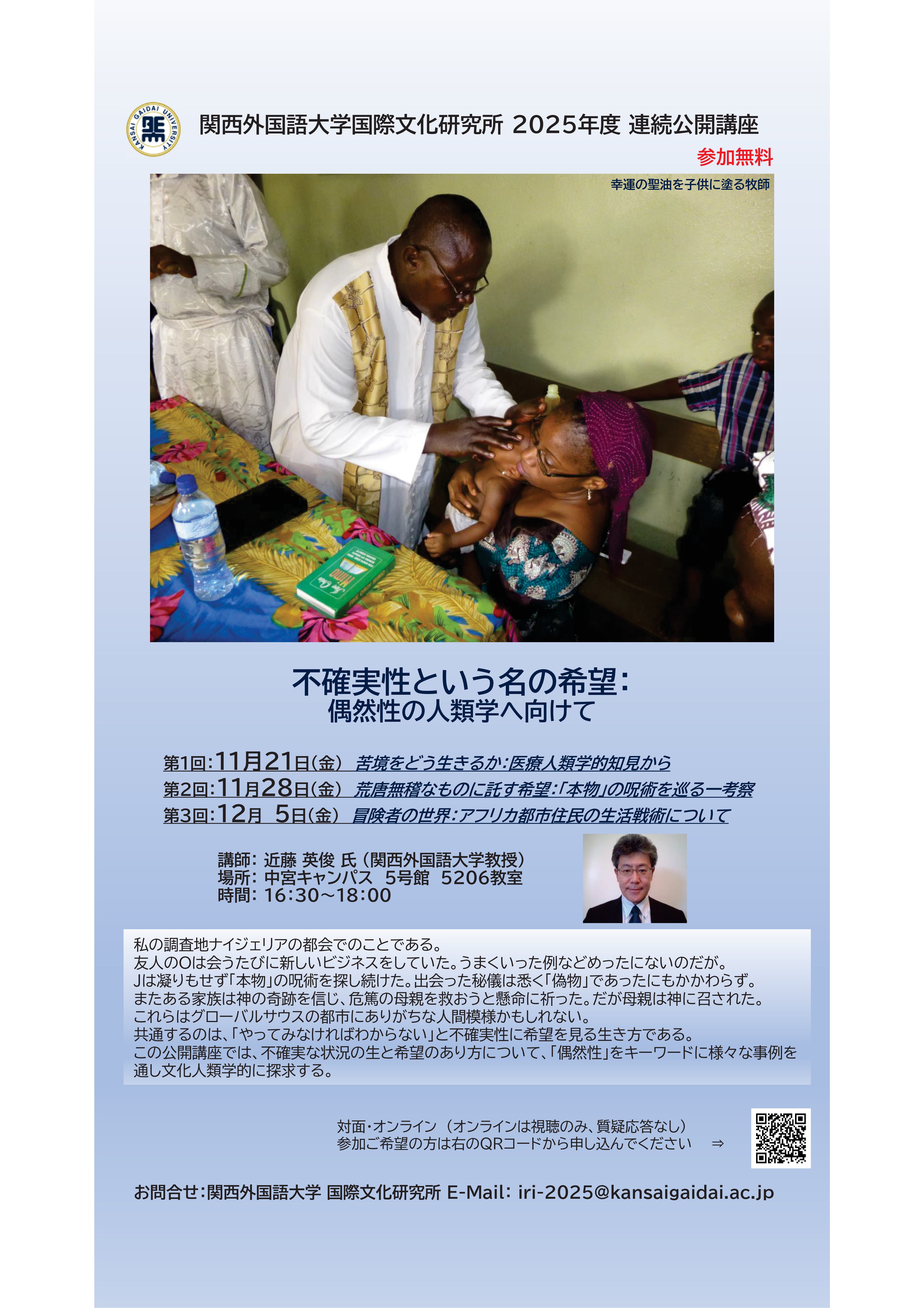 関西外国語大学国際文化研究所は、11月21日(金)、28日(金)および12月5日(金)の計3回にわたり、連続公開講座「不確実性という名の希望:偶然性の人類学へ向けて」を中宮キャンパスで開きます。時間は午後4時30分~午後6時 (開場:午後4時)で、いずれも参加無料。