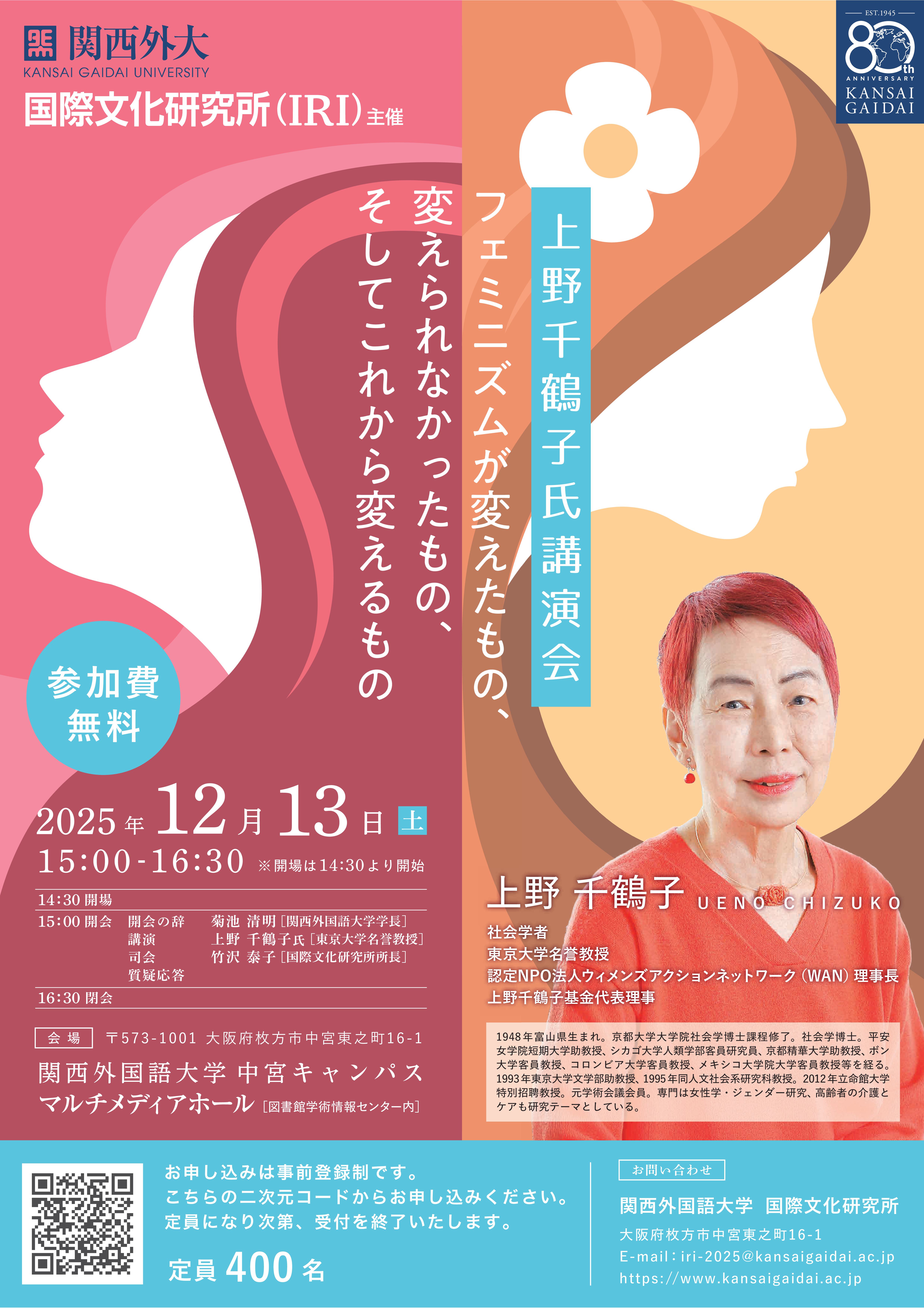 関西外国語大学 国際文化研究所は12月13日、社会学者で東京大学名誉教授の上野千鶴子氏による講演会を中宮キャンパスのマルチメディアホールで開催します。