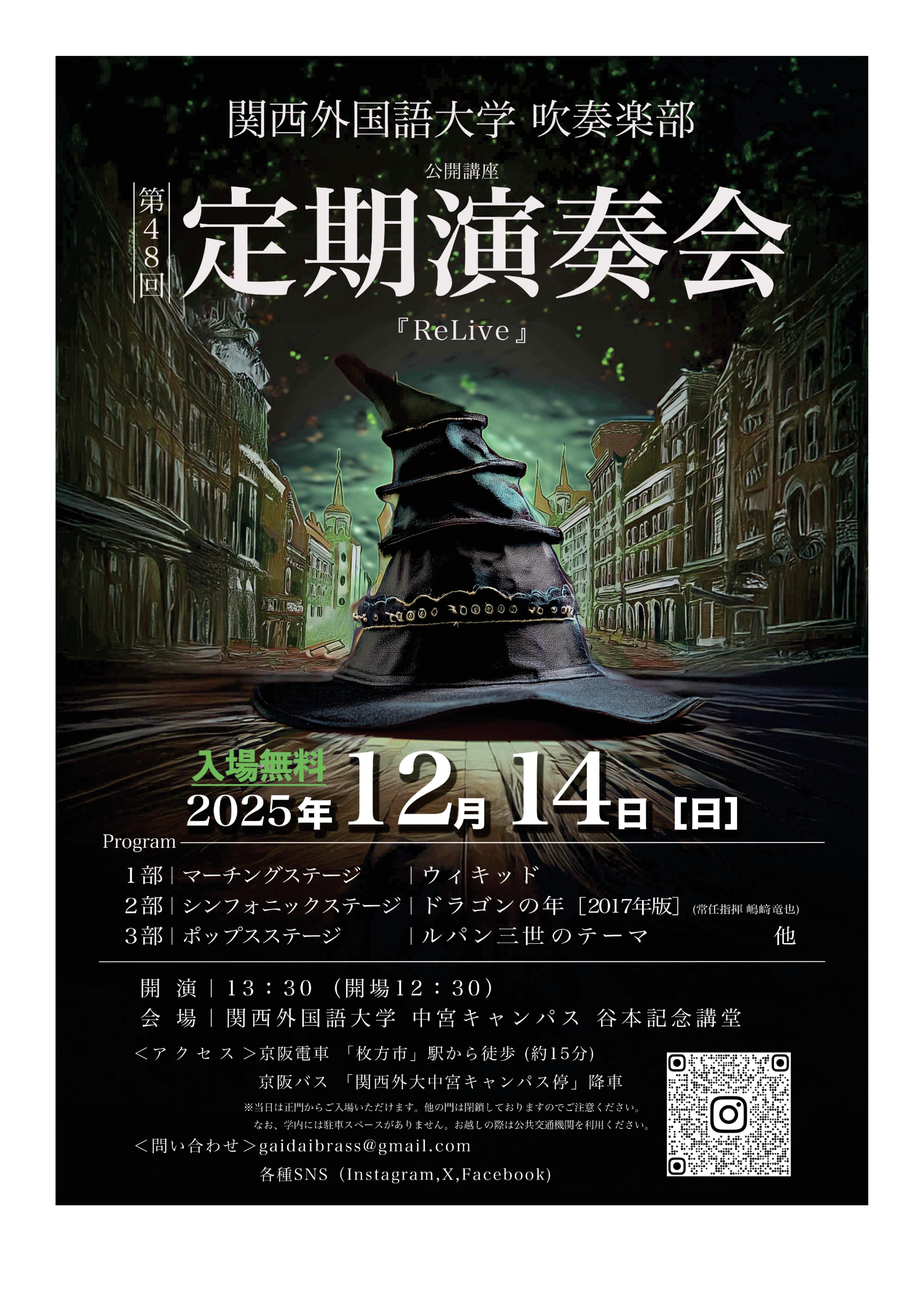 関西外国語大学(大阪府枚方市)吹奏楽部は、「第48回定期演奏会」を12月14日(日)、中宮キャンパス谷本記念講堂で開催します。